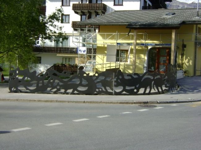 Nach der Idee und Vorlagen des Künstlers Roland Faesser stellen wir einen sehr originellen Zaun her. Mit unserer Plasma-Brennanlage haben wir die grossen Blechtafeln bearbeitet. Nach dem Sandstrahlen und Oberflächenschutz erfolgt die Montage beim Kindergarten Laax.